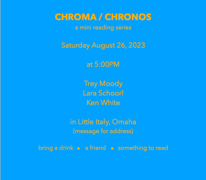 Trey Moody is the author of Autoblivion (Conduit Books, forthcoming 2023), winner of the Minds on Fire Open Book Prize, and Thought That Nature (Sarabande Books, 2014), winner of the Kathryn A. Morton Prize in Poetry. His poems have appeared in The Atlantic, The Believer, and New England Review and received the Poetry Society of America’s 2023 Robert H. Winner Award. He teaches at Creighton University and lives with his daughter in Omaha, Nebraska.