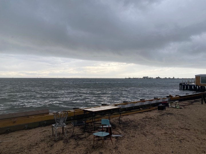 Image description: Horizontal color photo of provincetown bay on a gray cloudy day with sunshine trying to break through just over the horizon. In the foreground is seaweedy sand with old mismatched chairs and a table, bordered by a wood retaining wall. The water is dark gray with white highlights, and there are piers stretching out across the water in both the mid and far distance.