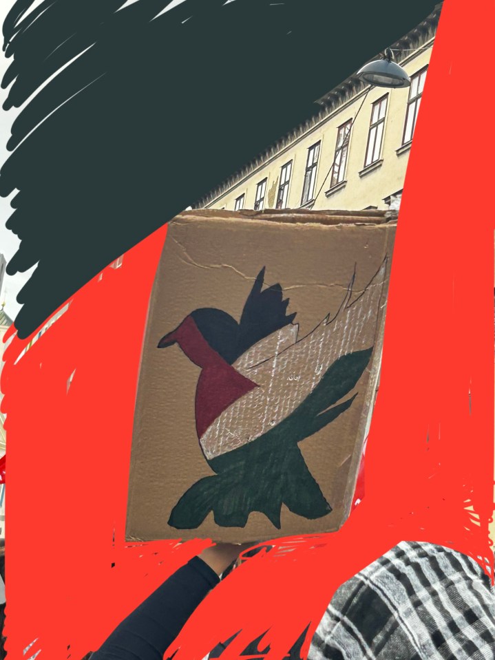 My heart was full and I lost my self in the crowds, I could not find my friends for a while, but I did not mind it. I was enjoying being one with the people, who were from very different backgrounds and age groups. Therefore, we turned that day from ‘terrorists’ to ‘terror supporters’ according to the reporters (too many queers to accuse to be Hamas), this is only some days after a white Austrian friend was framed as ‘Trans-Muslim’ (no joke!).